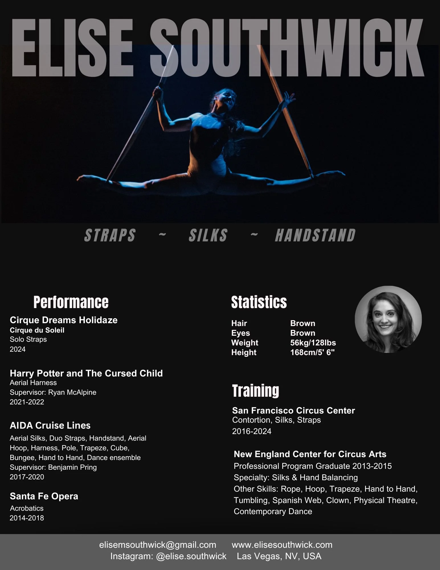 Elise Southwick is an award-winning circus artist and champion aerialist at the Las Vegas International Variety Act Festival. She specializes in Aerial Silks, Strap Loops, and Hand Balancing. Her performances include Cirque Dreams Holidaze by Cirque du Soleil, the Broadway Play “Harry Potter and the Cursed Child,” AIDA Cruise Lines, The Santa Fe Opera and The Ringling Museum. She received her training at The New England Center for Circus Arts in the Professional Track Program (class of 2015).
